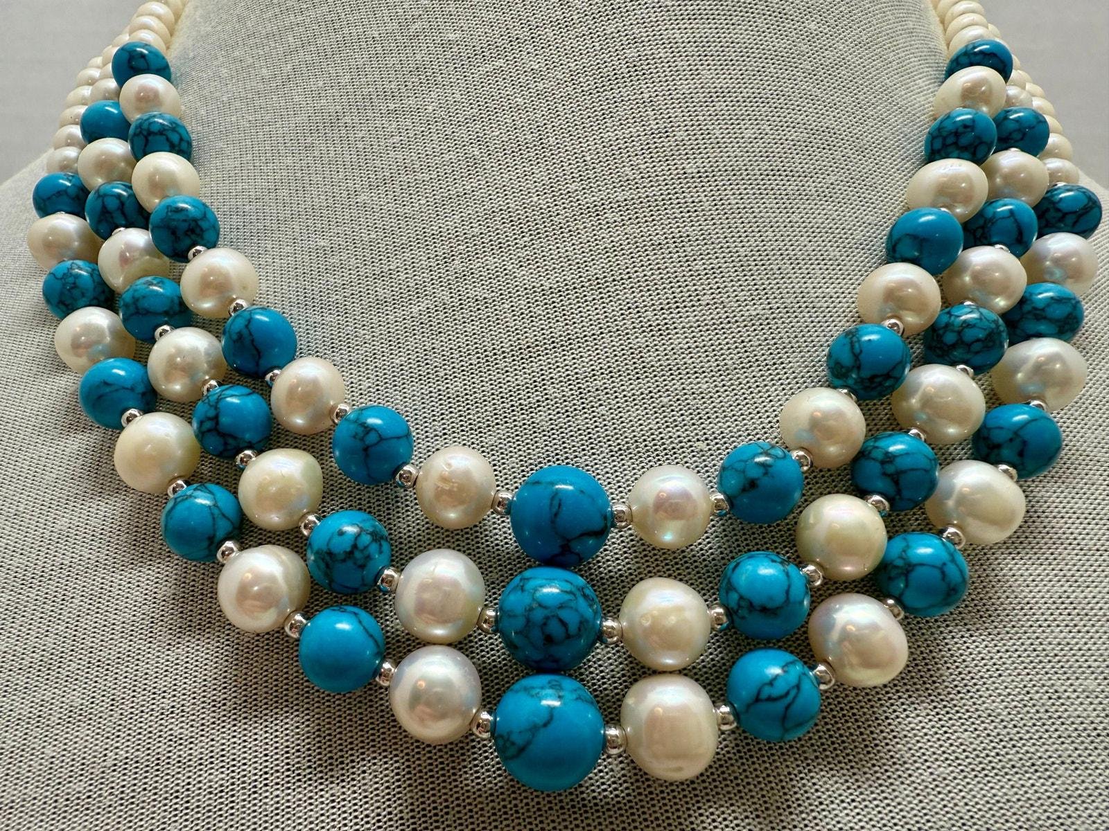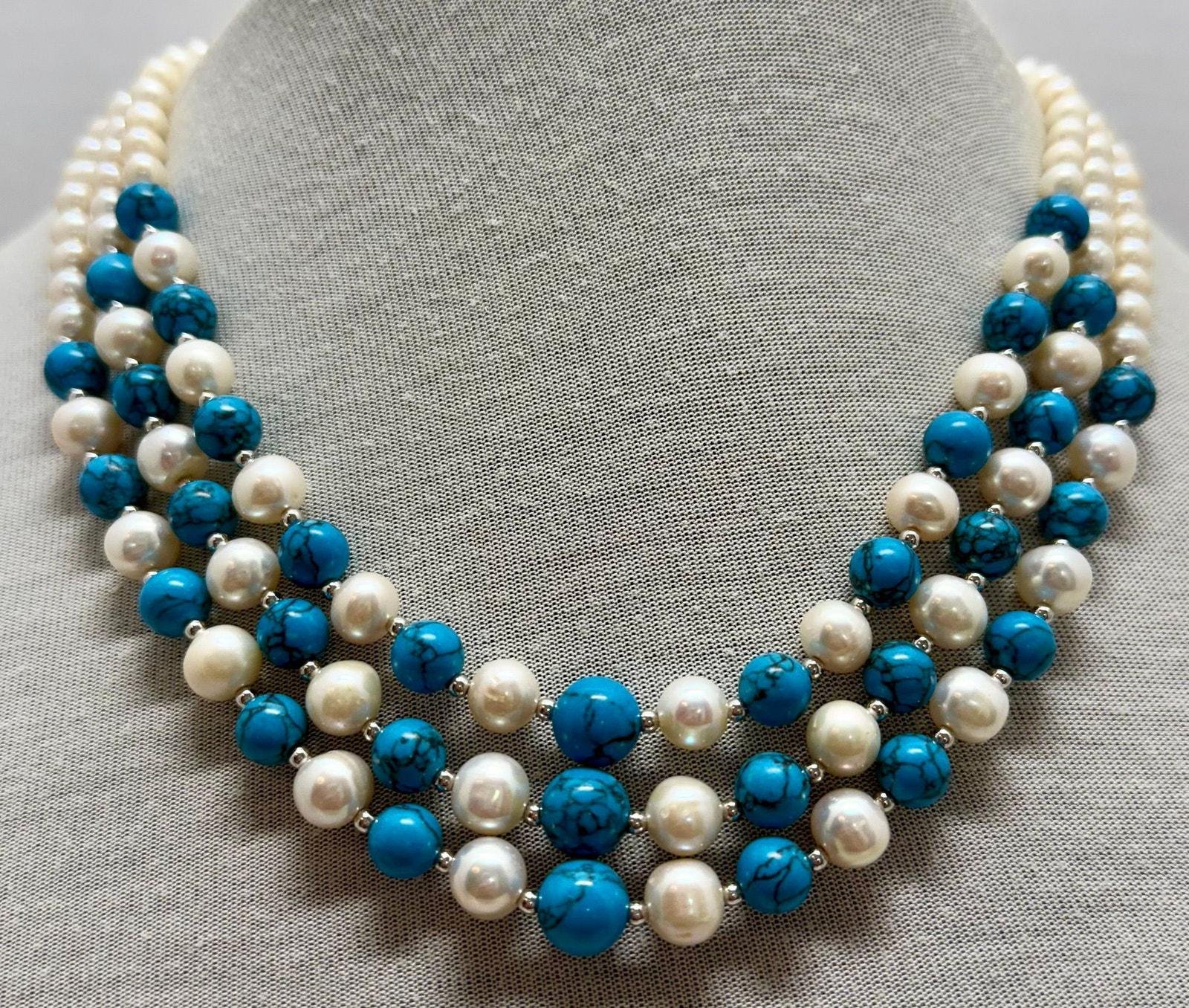 Danbury Mint Triple Strand Freshwater Pearl And Blue Howlite Bead 925 Necklace