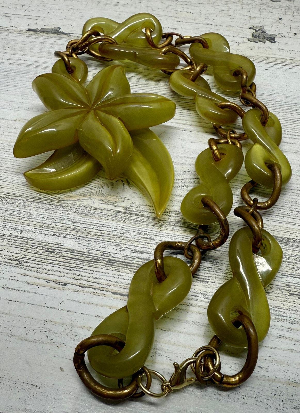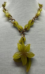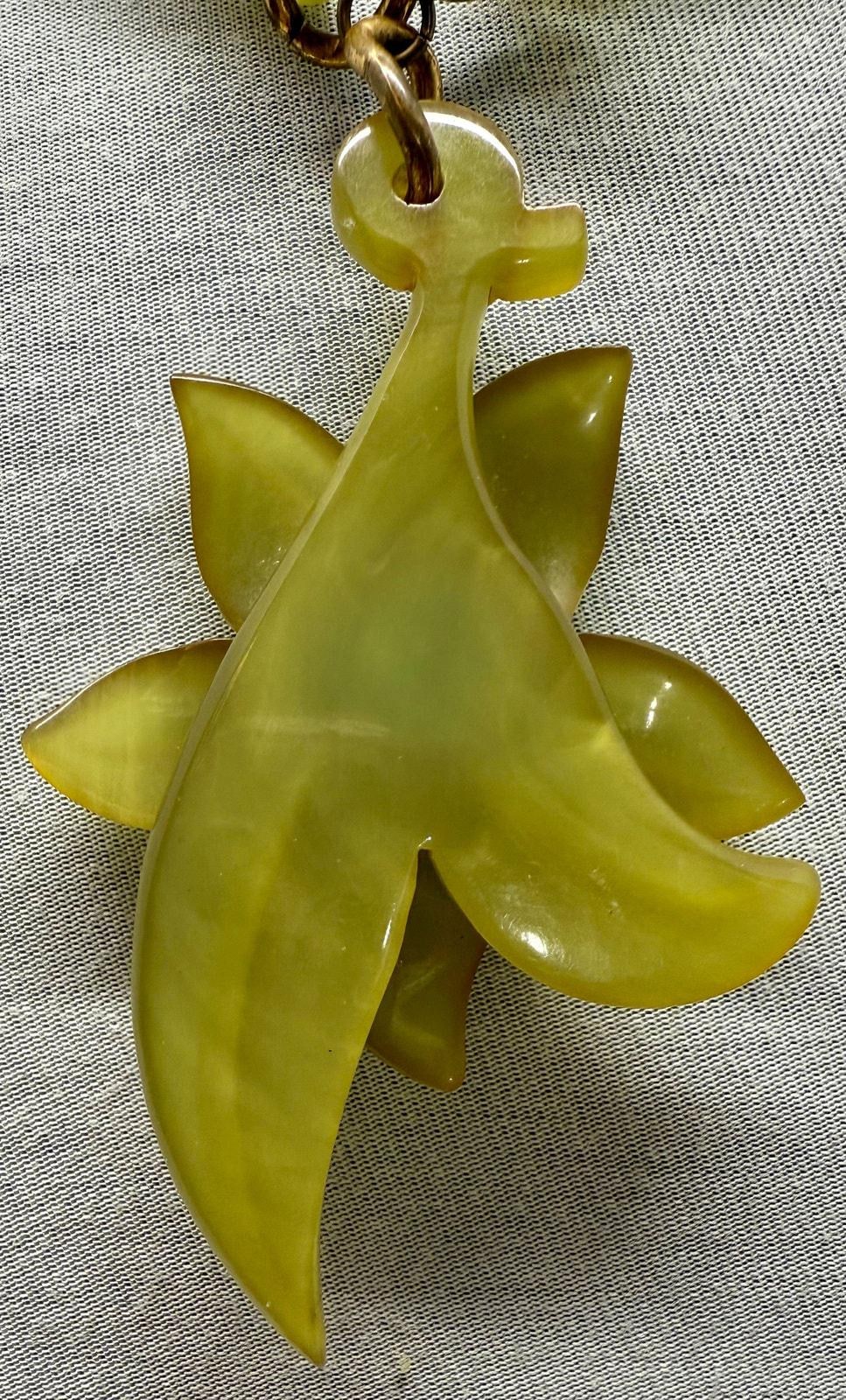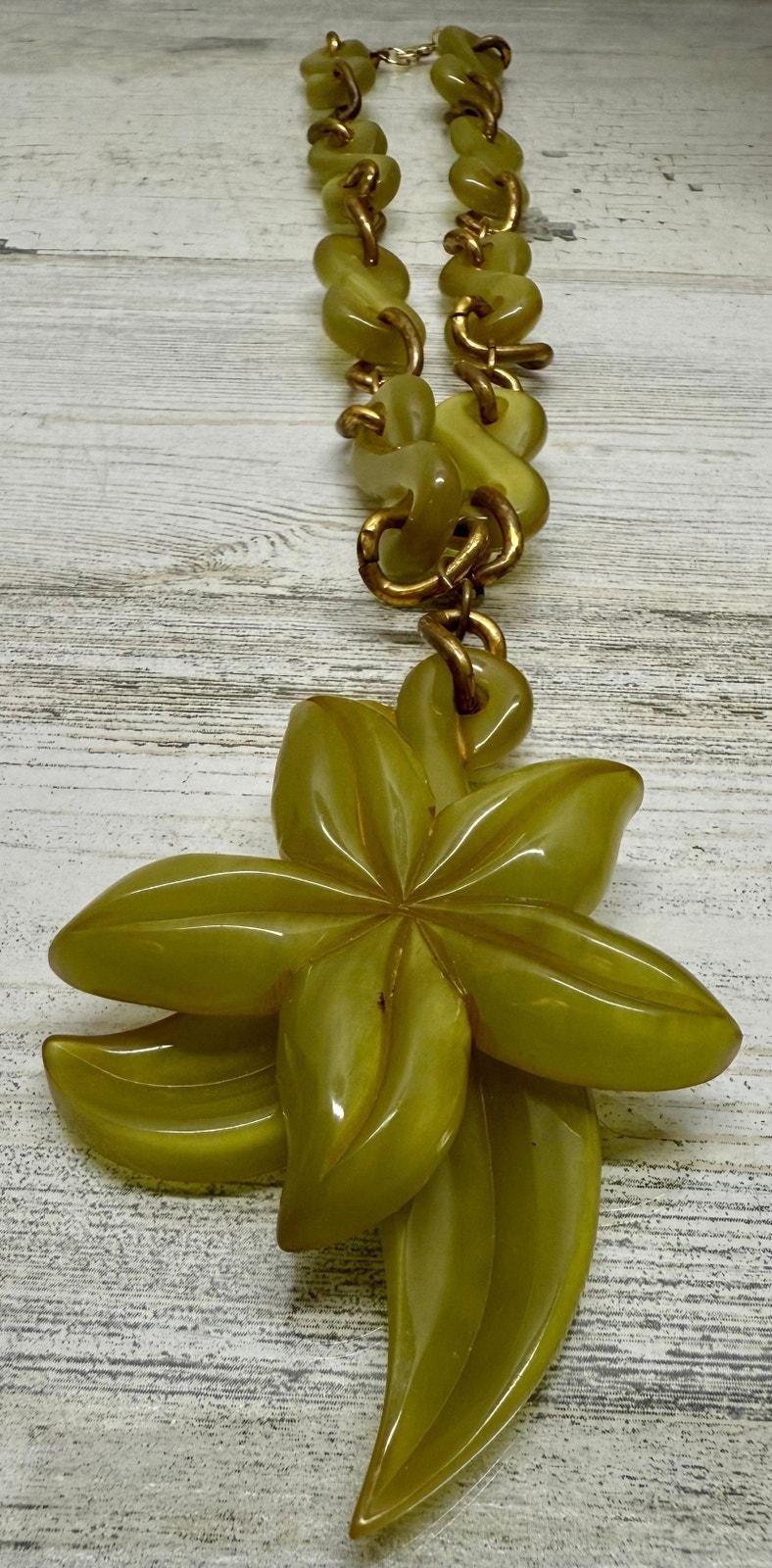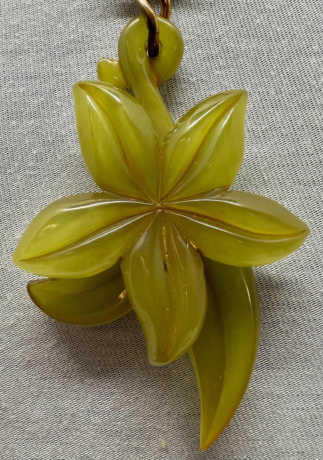 Vintage 1940s Avocado Green Bakelite Floral Pendant/Bead & Gold Tone Necklace