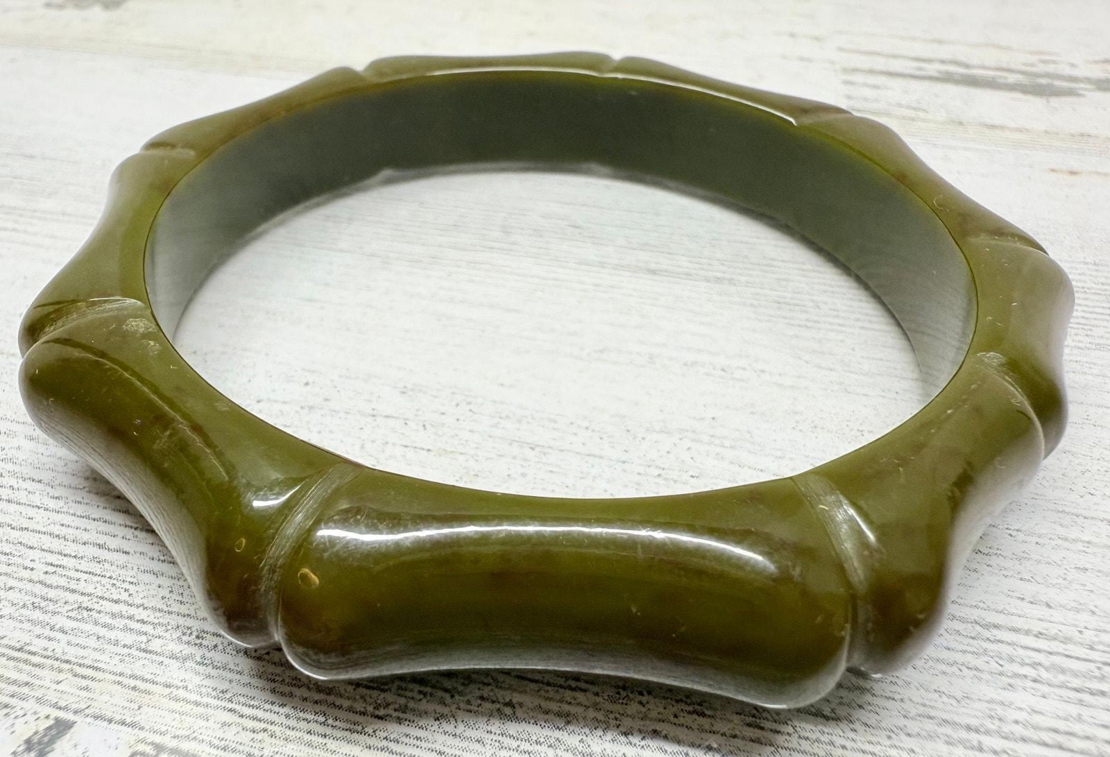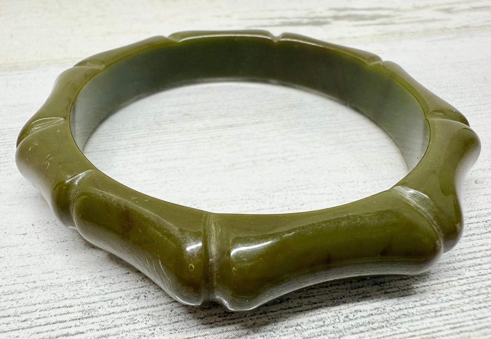 Vintage 1940s Olive Green Carved Bamboo Style Bakelite Bangle Bracelet