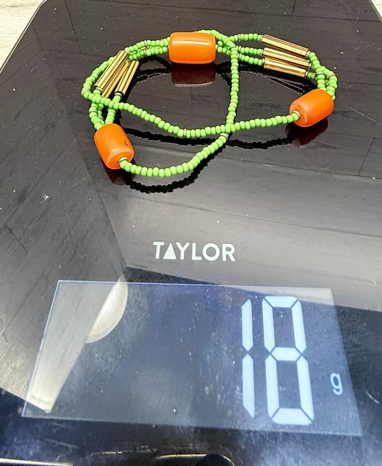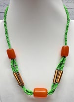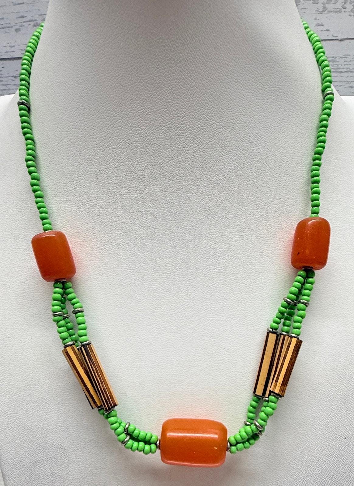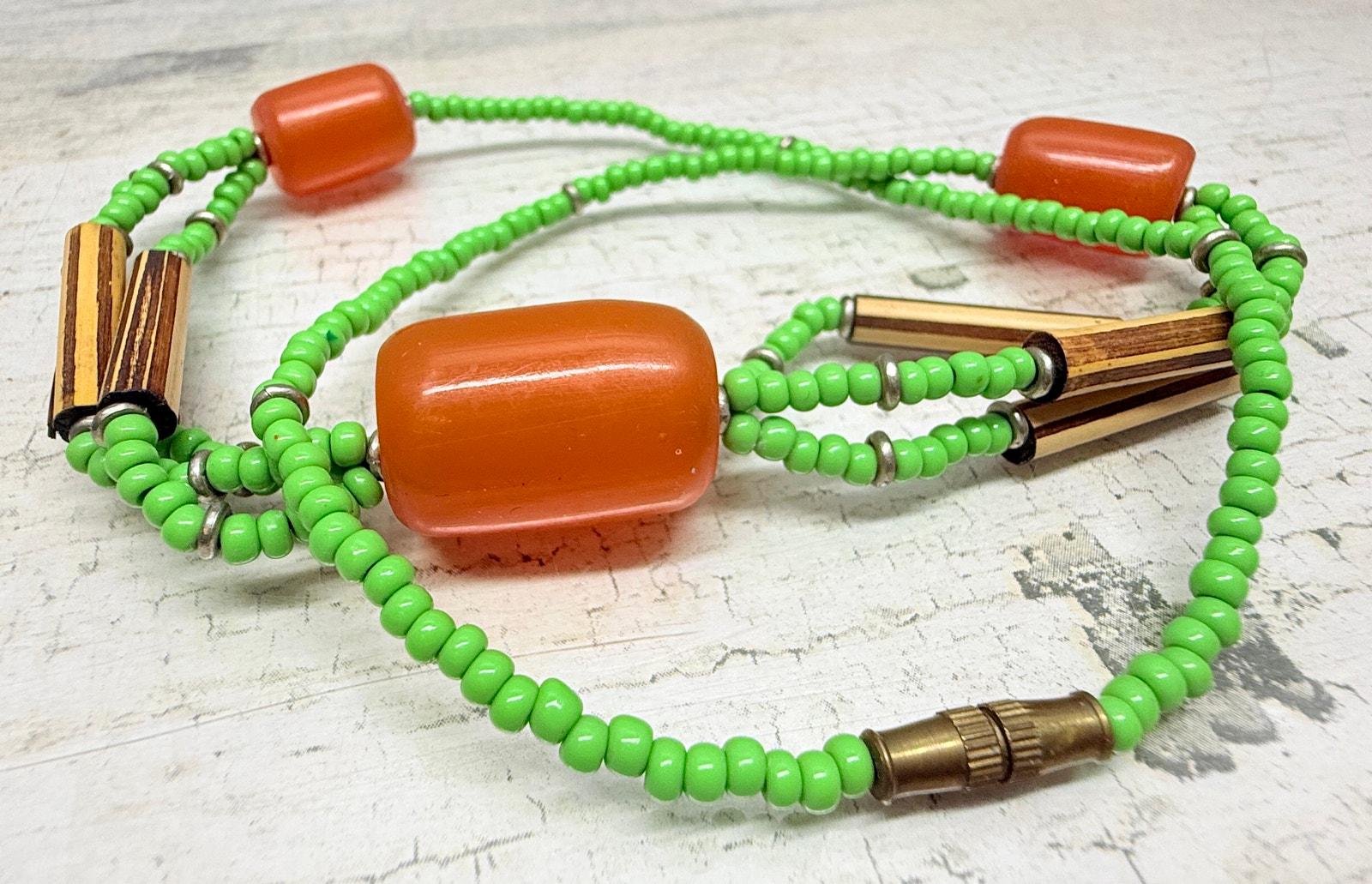 Vintage 1950s African Copal Orange Amber Green Glass Wood Bead Necklace