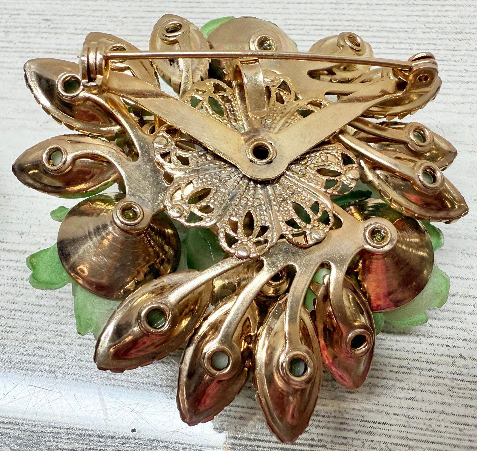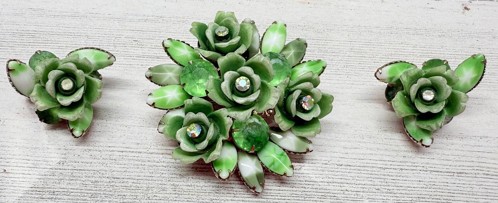 Vintage 1950s Celebrity Green Celluloid AB Rhinestone Brooch & Earrings