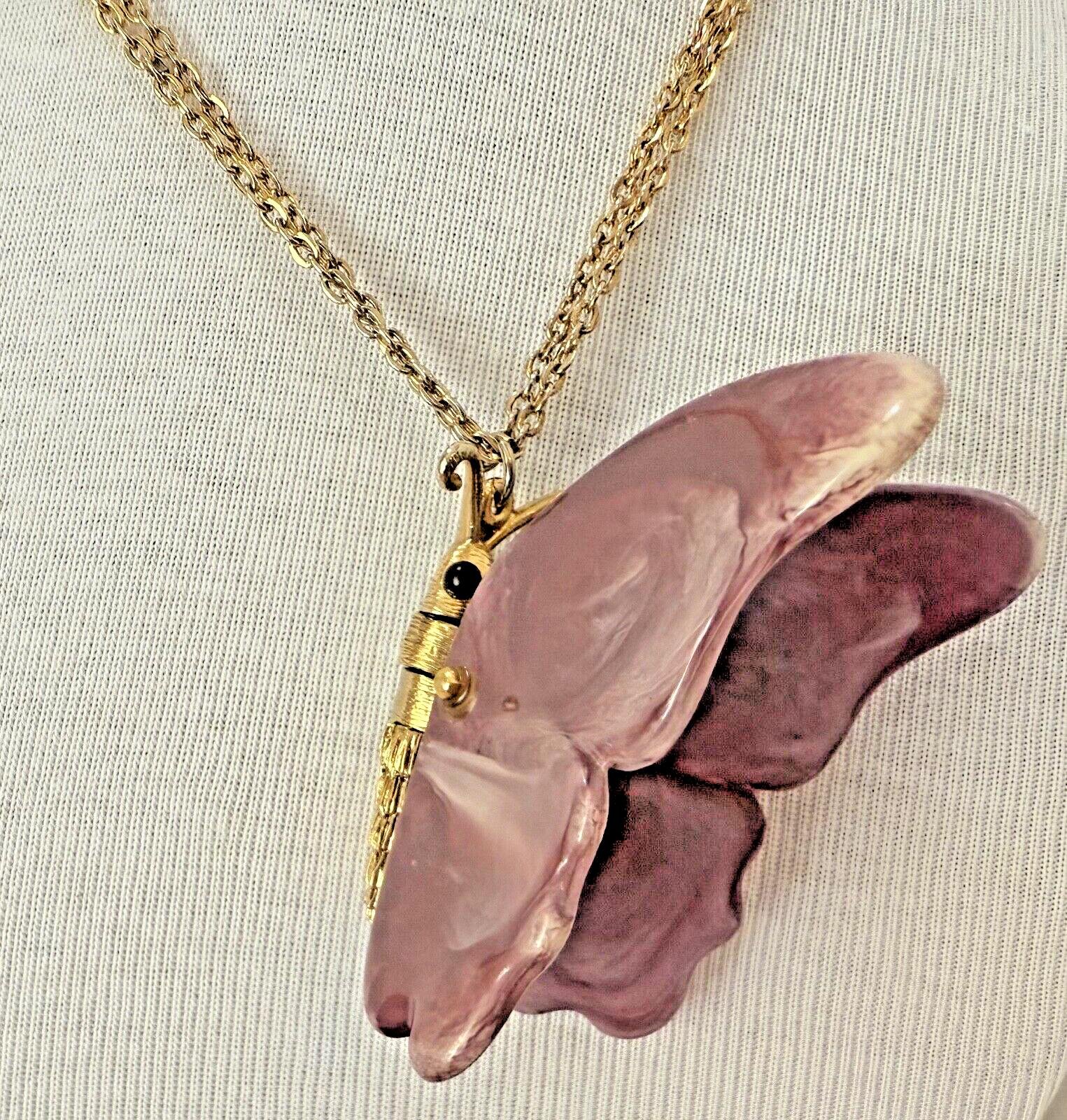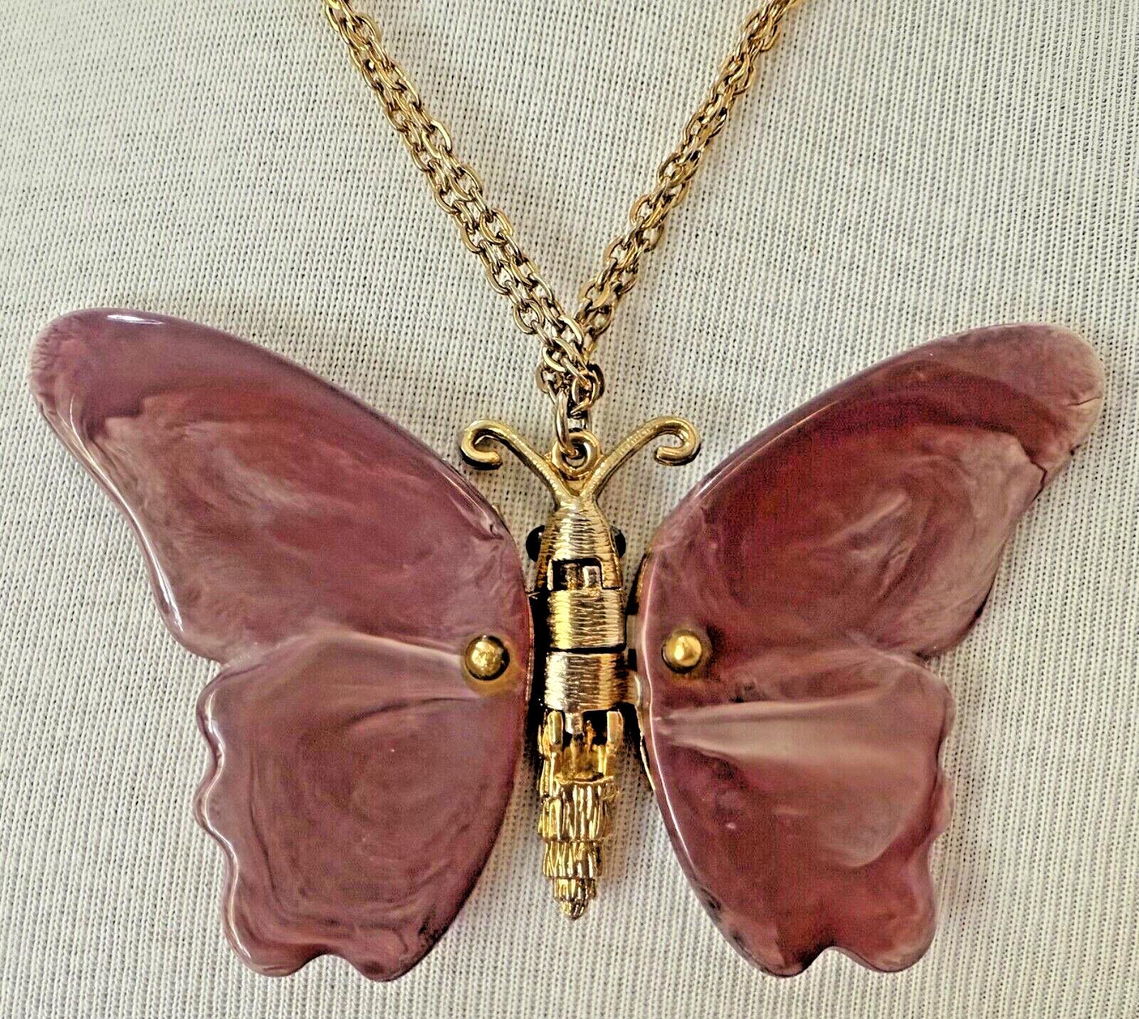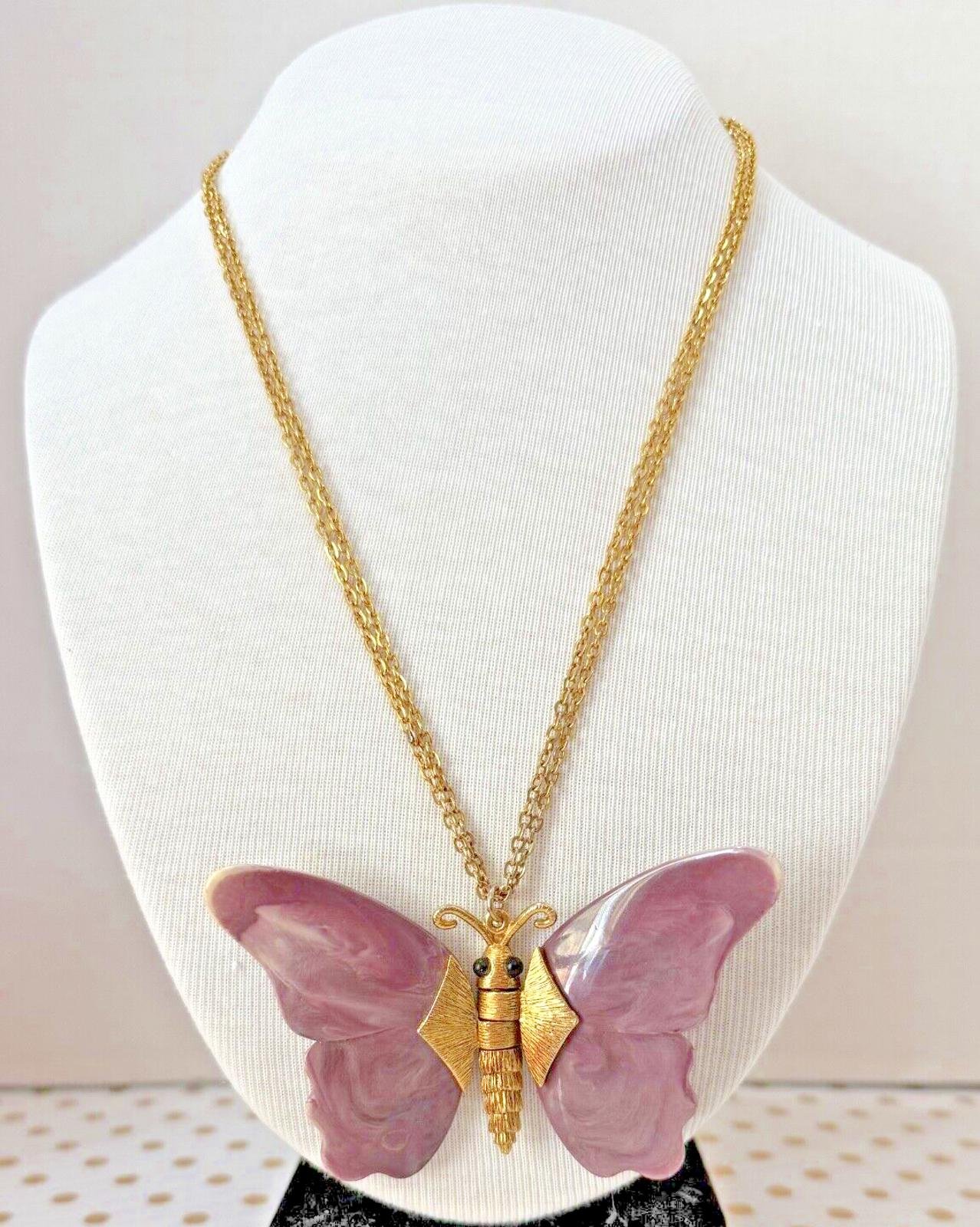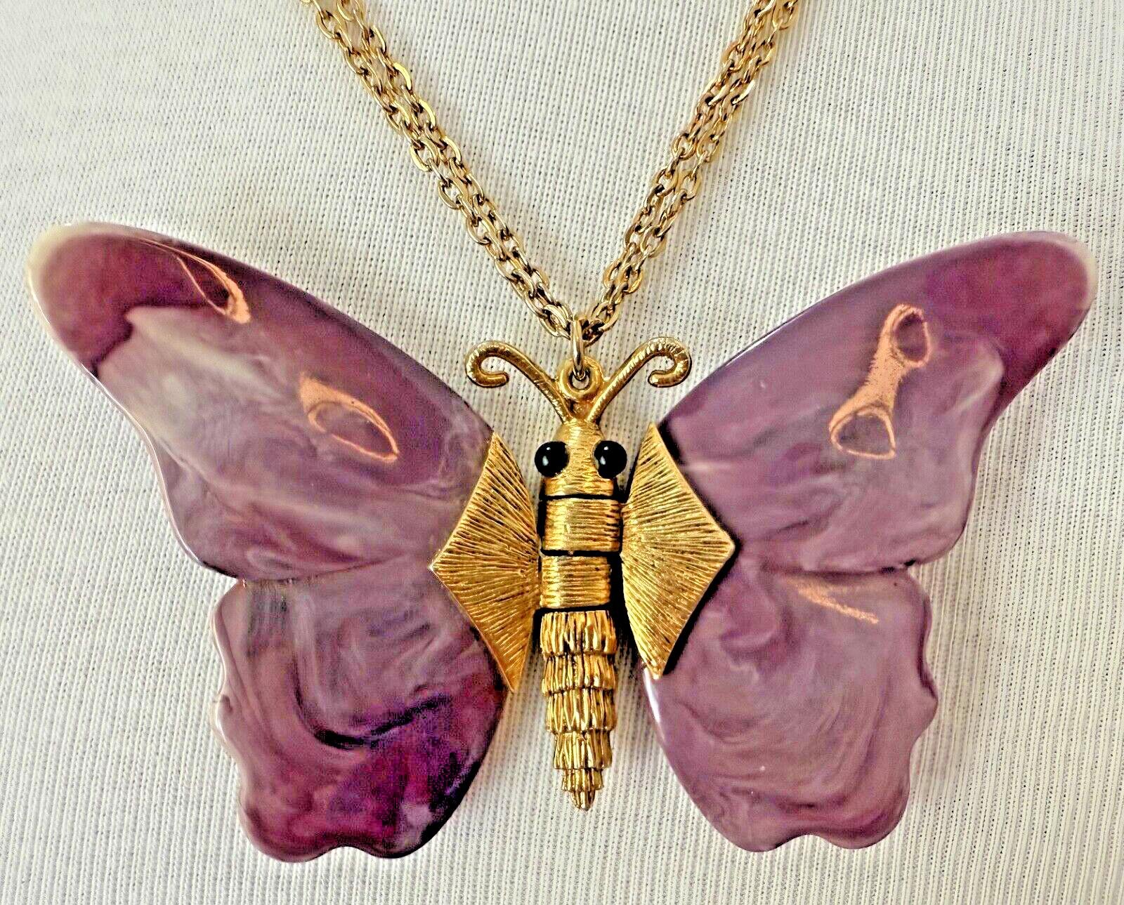 Vintage 1960s Gold Tone Purple Articulated Thermoset Lucite Butterfly Necklace