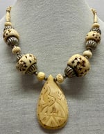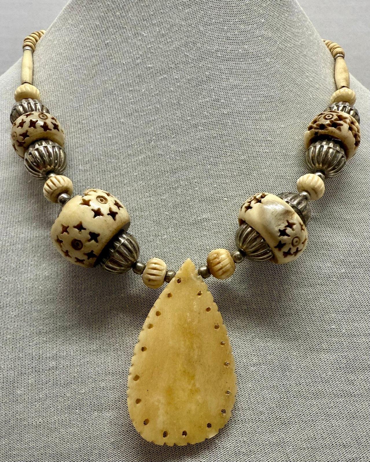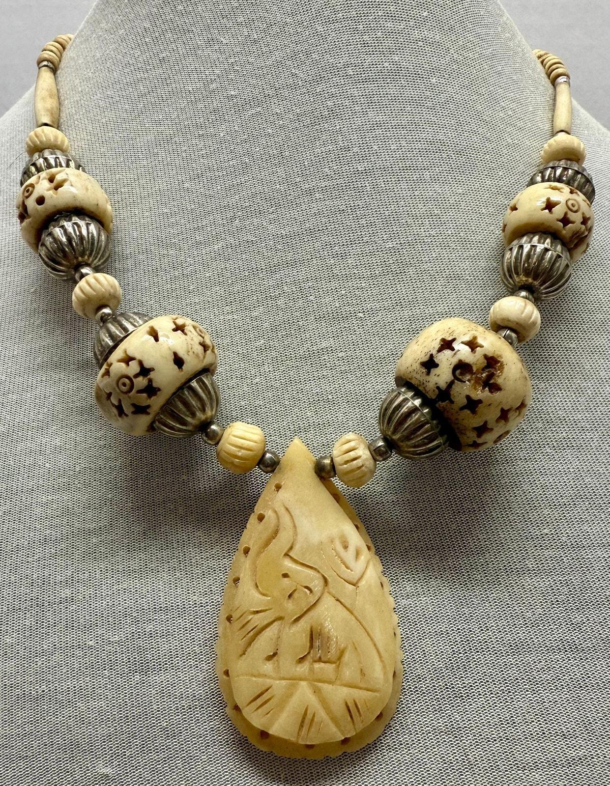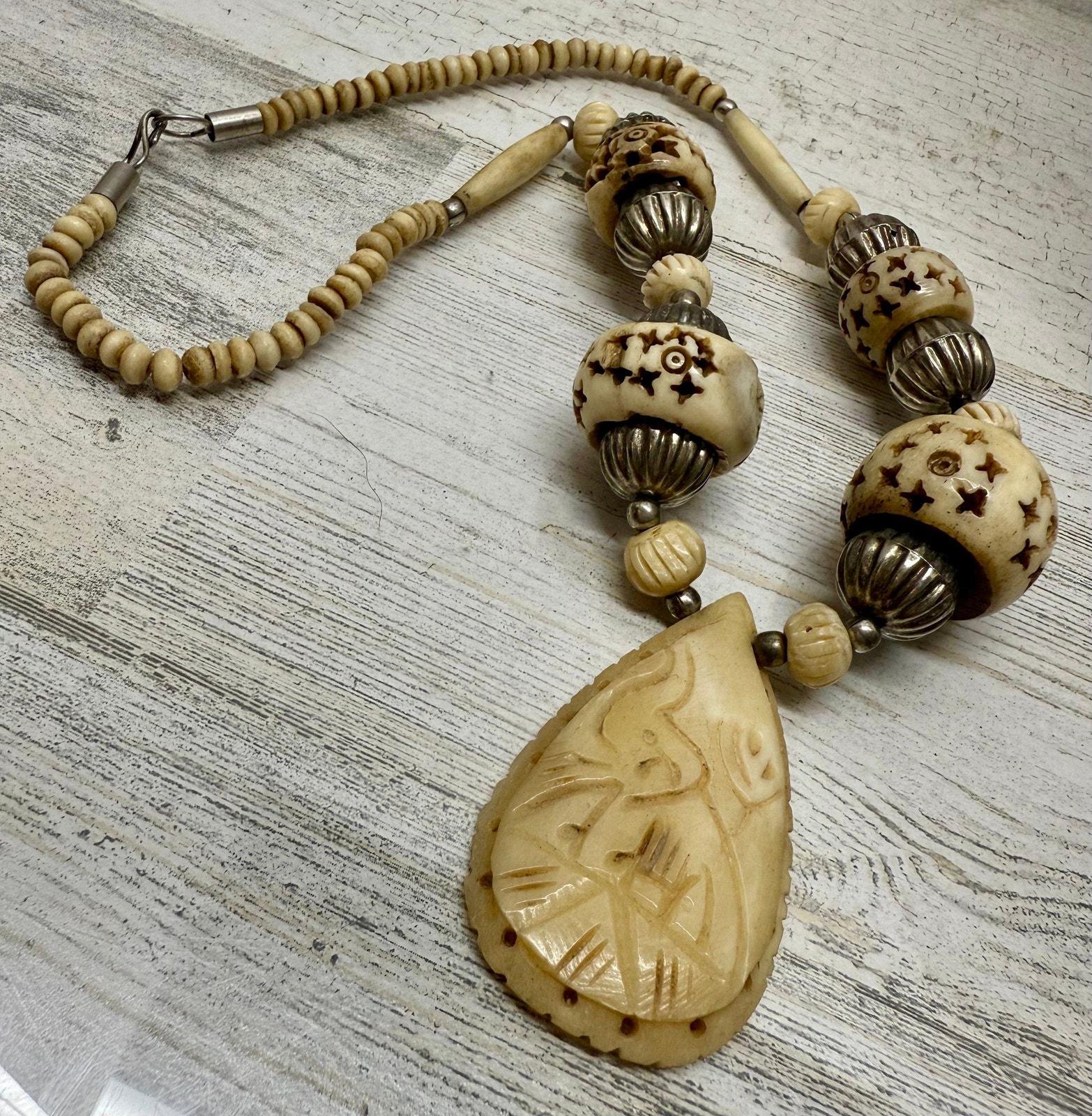 Vintage 1960s Hand Carved Bone Bead & Pendant with Silver Tone Metal Accents
