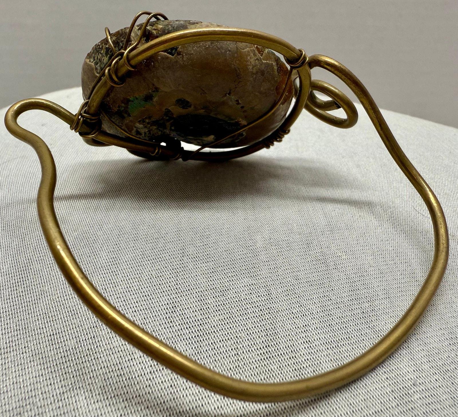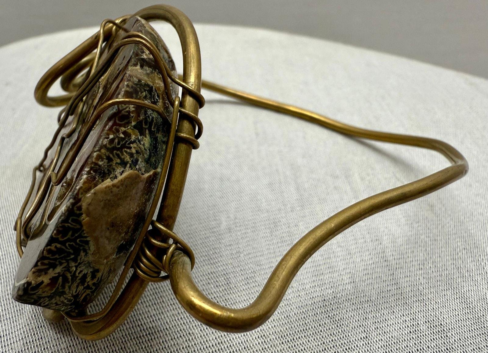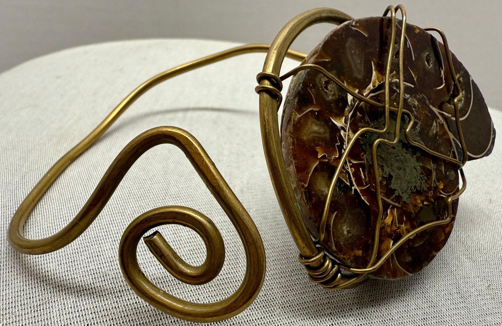 Vintage 1970s Ammonite Fossilized Shell & Brass Artisan Bracelet