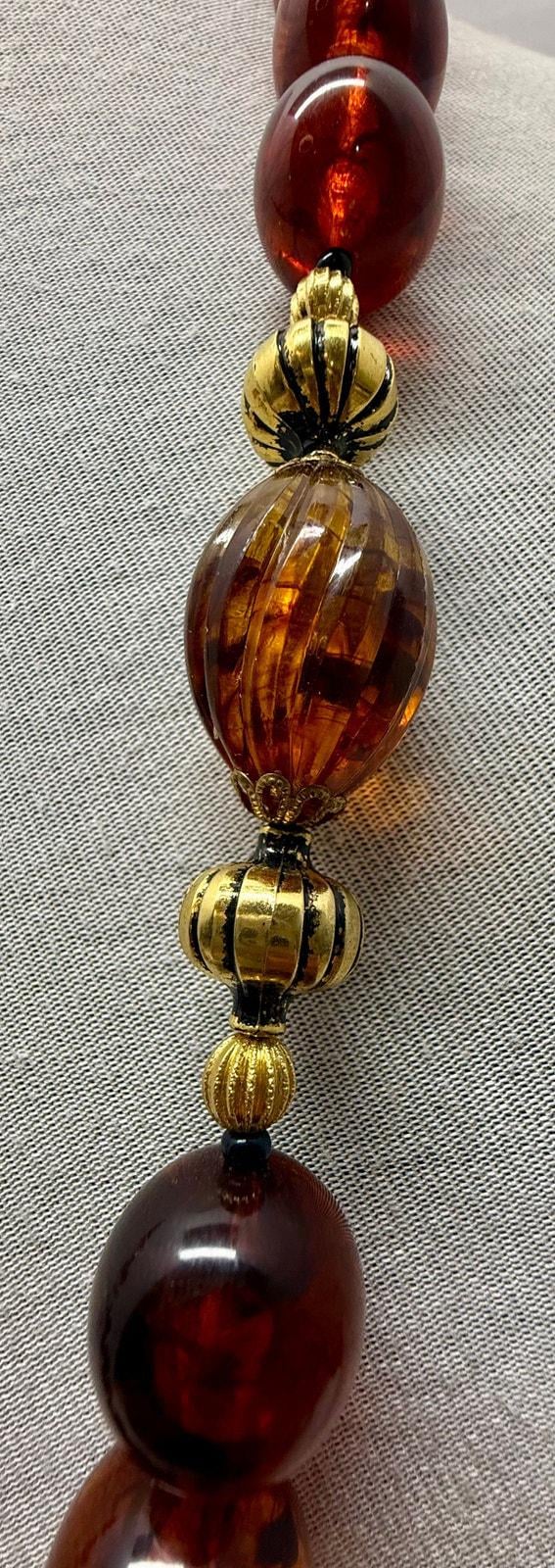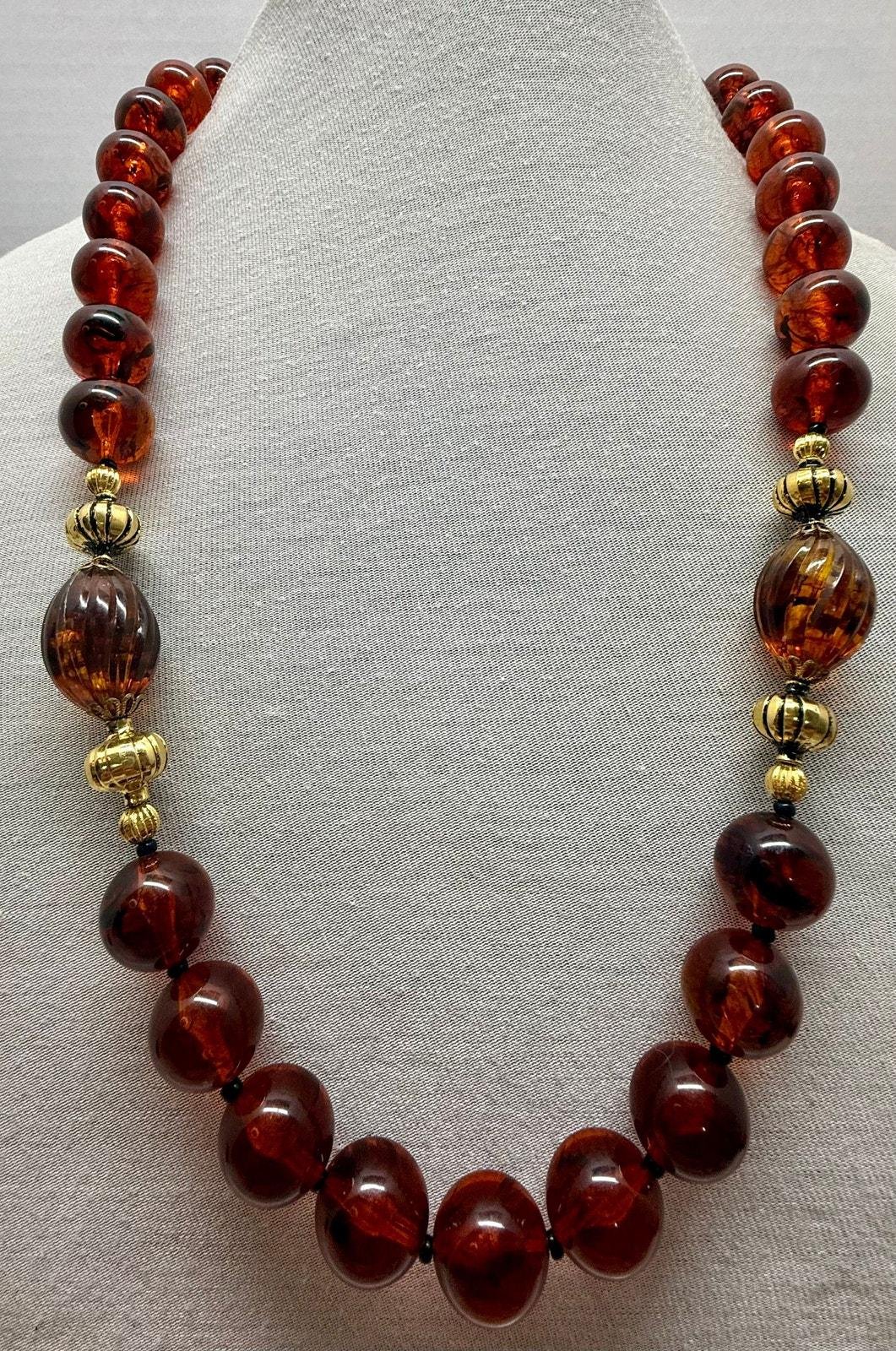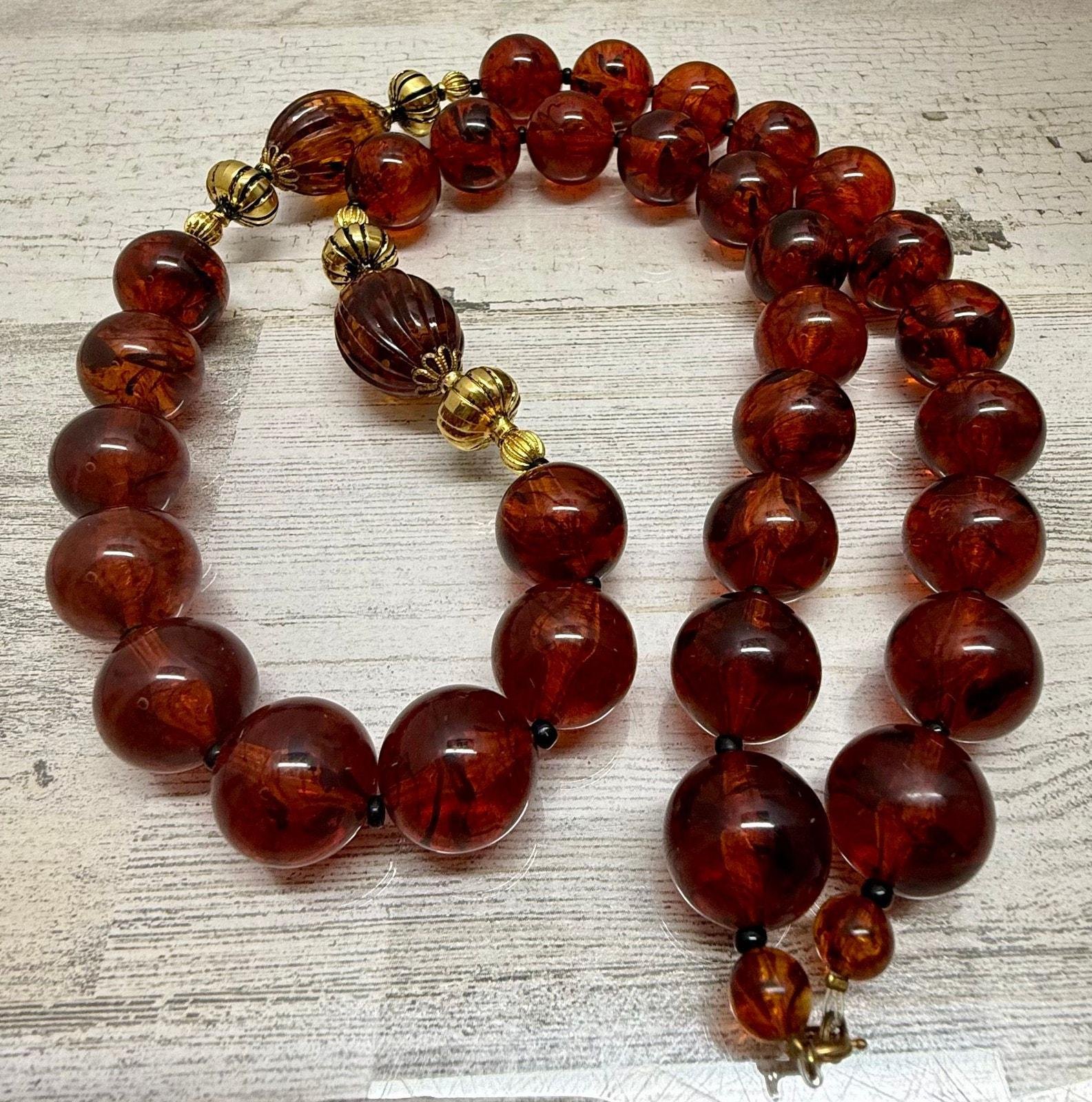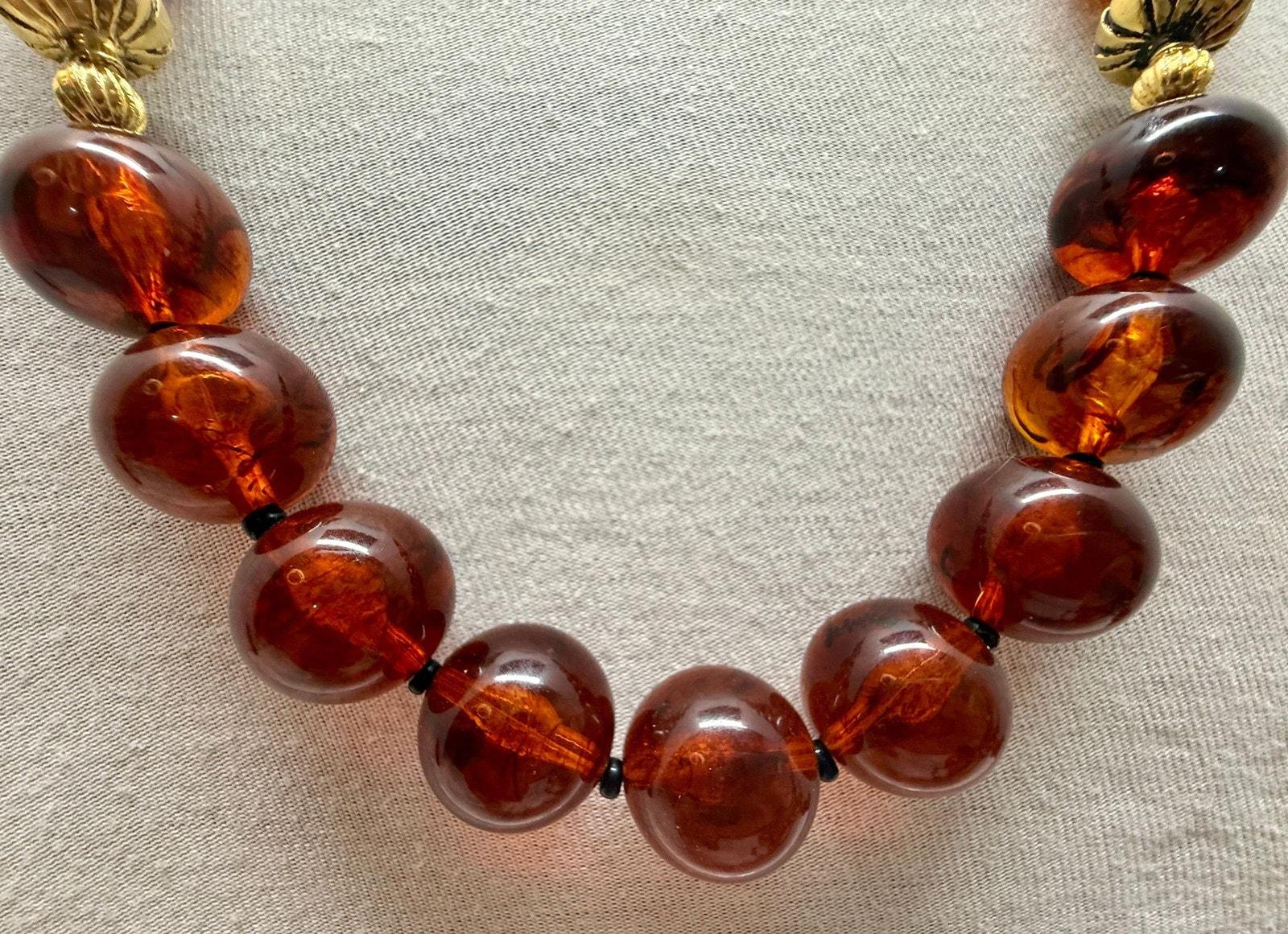 Vintage 1980s Faux Amber Lucite Root Beer Ball Bead & Gold Tone Necklace