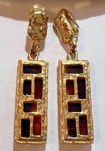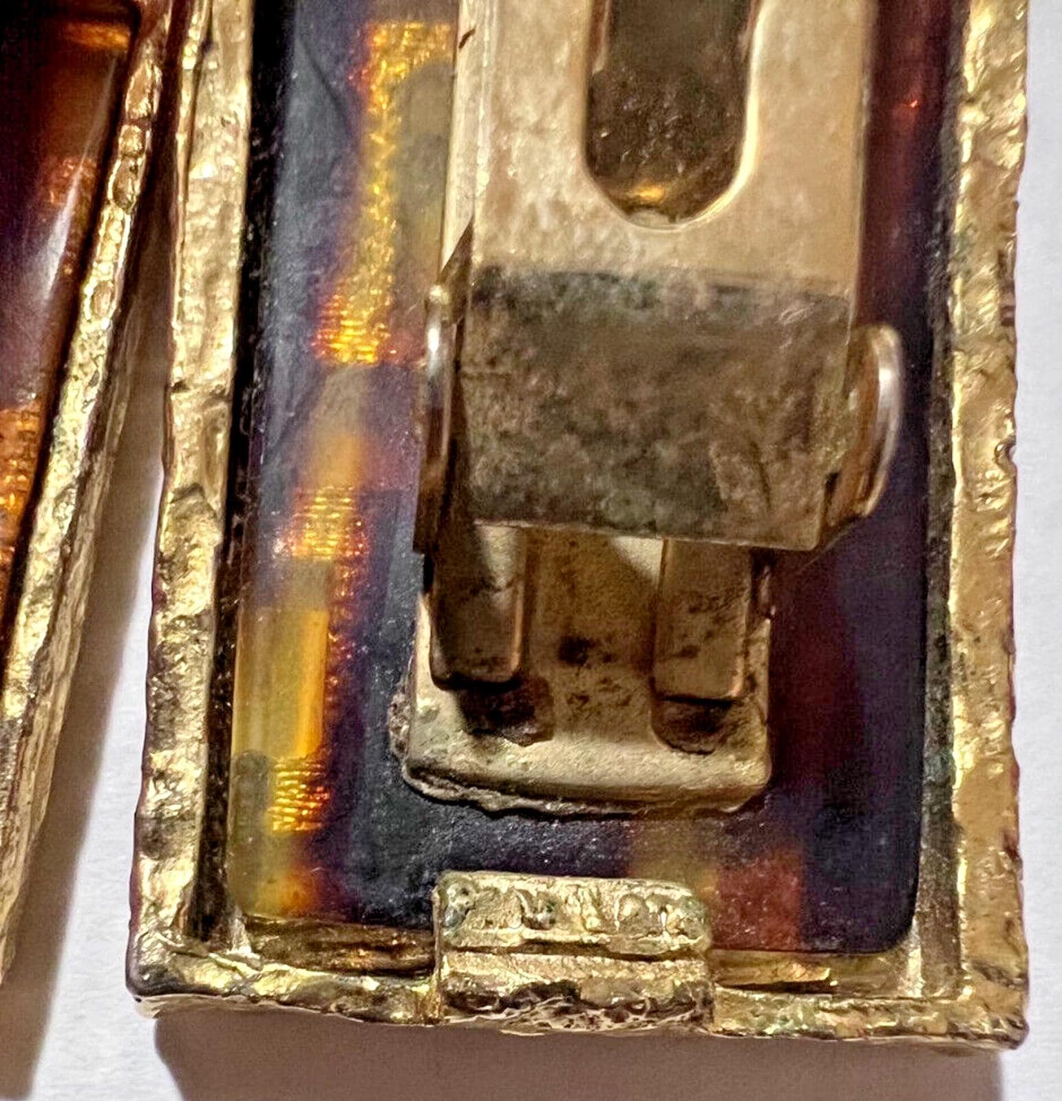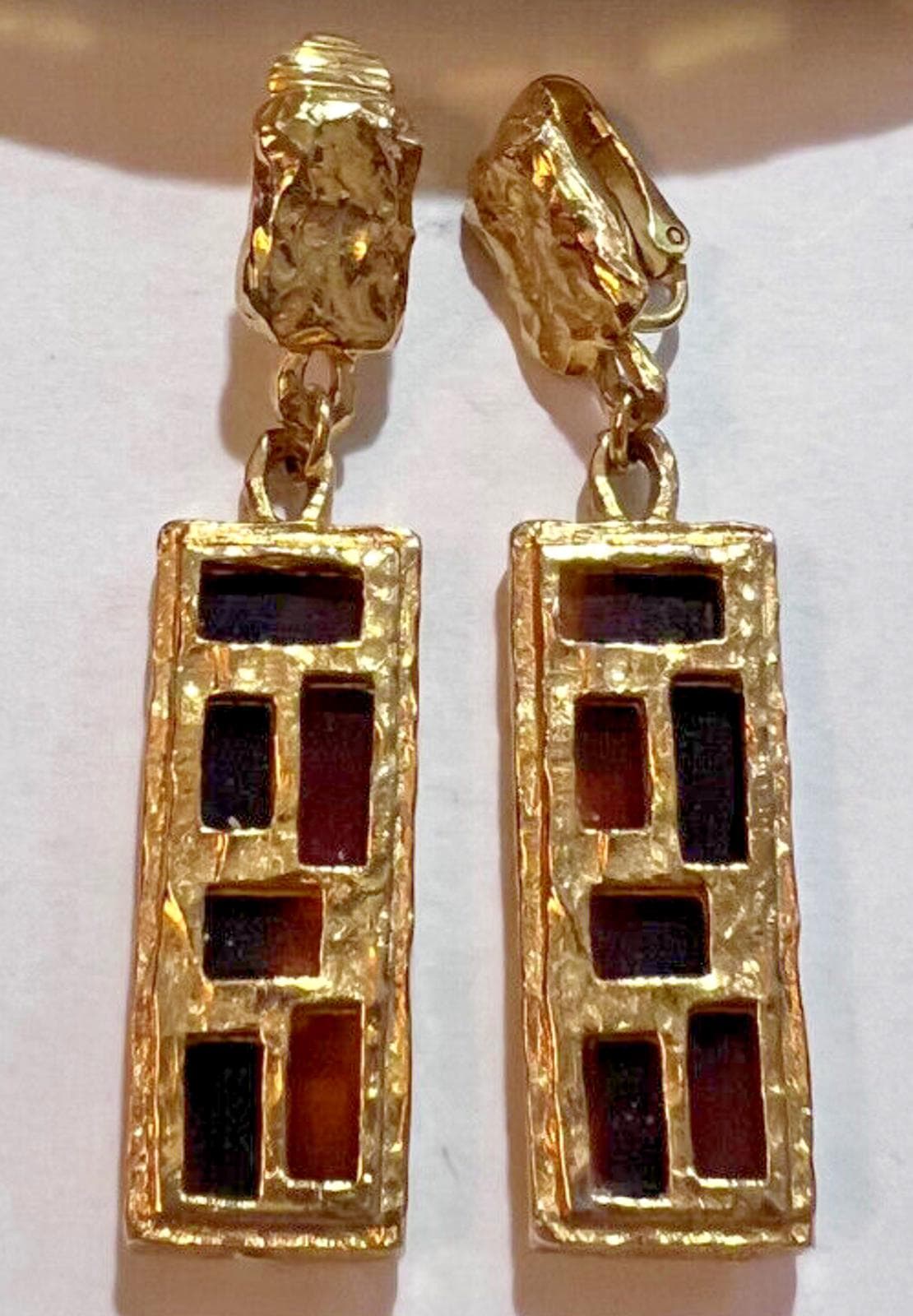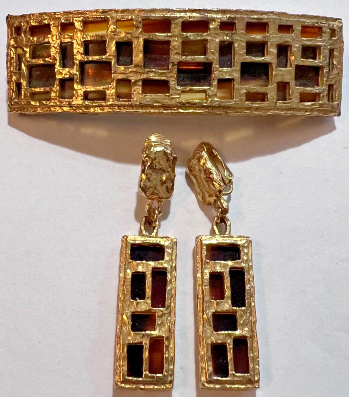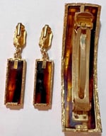 The set includes a beautiful barrette and earrings pair, all made of gold-tone metal with a stunning multi-tone brown glass inlay as the main stone.