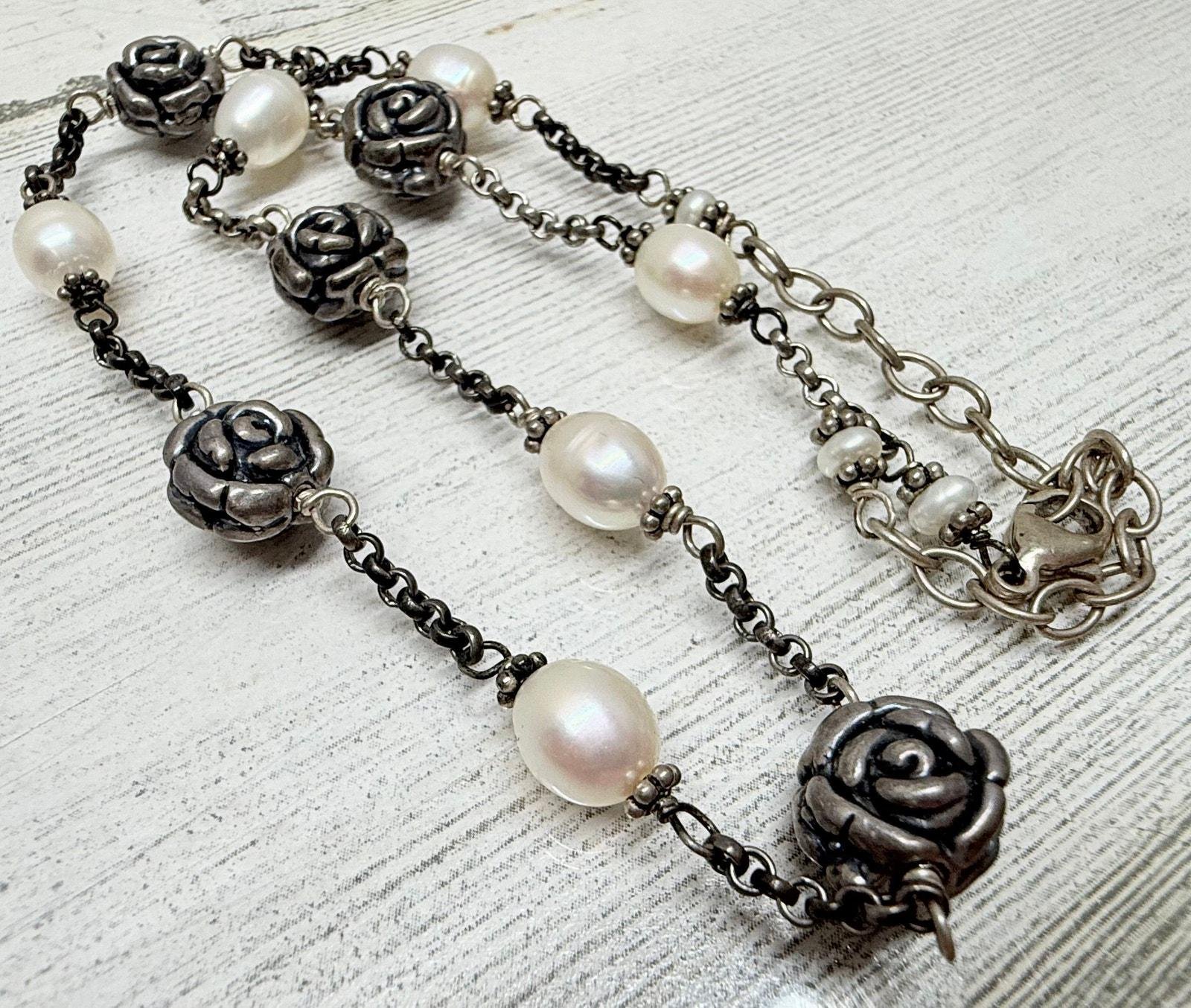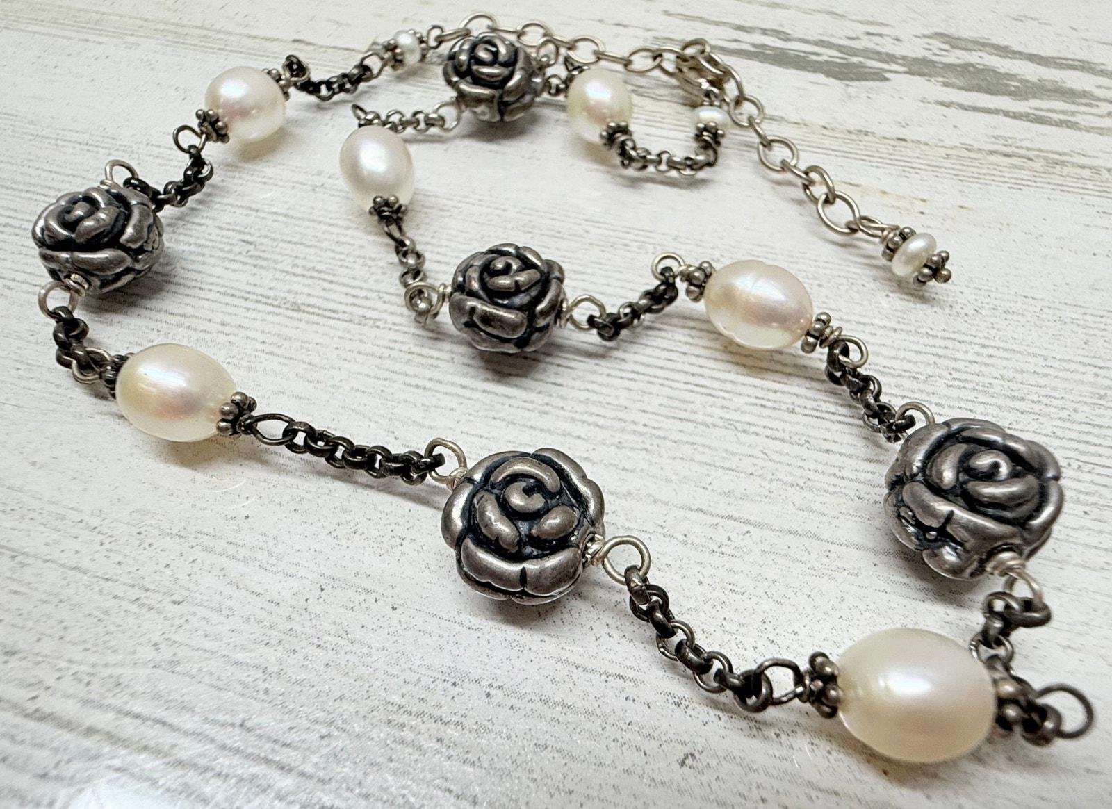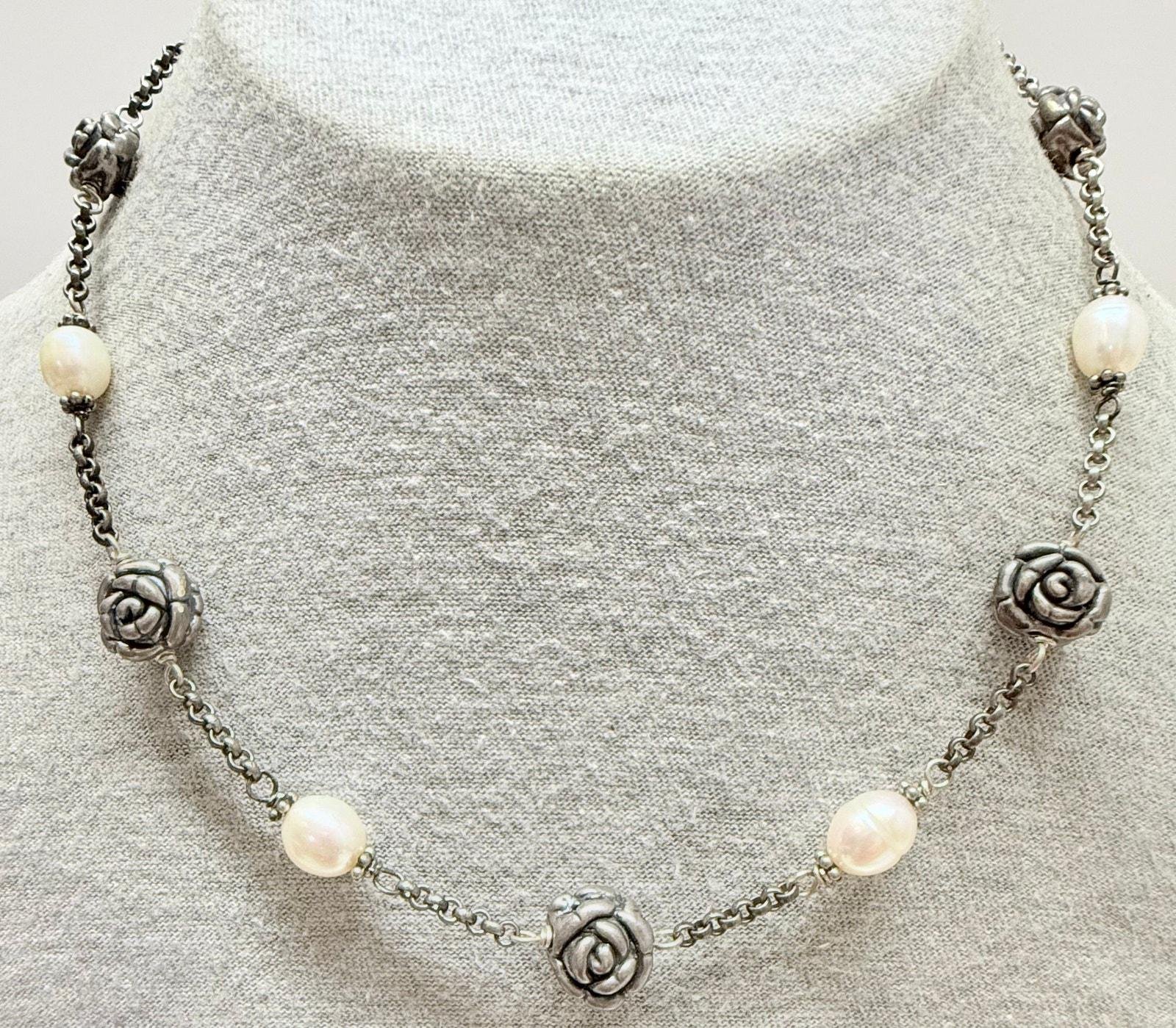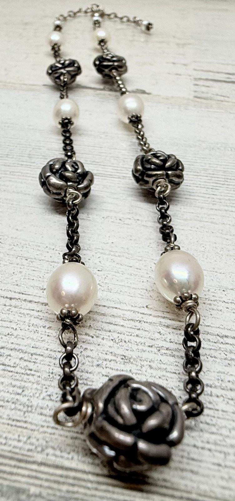 Vintage 1990s 925 Silver Rose & Freshwater Pearl Necklace